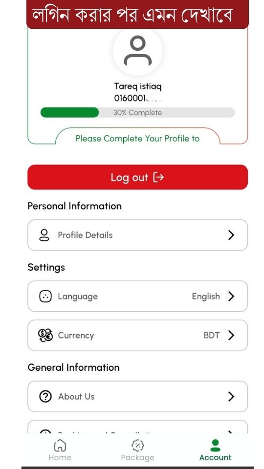 রেজিস্ট্রেশন সফল হলে এমন প্রোফাইল দেখাবে